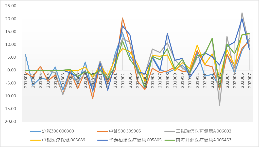如果我们将大盘指数(沪深300)和中小盘指数(中证500)的月度涨跌与前面提到的8只基金的月度收益做对比,这样可以看出哪只基金持续突出。综合图2和图3信息可知,华泰柏瑞医疗健康和工银瑞信医药健康A、财通资管消费精选和华安研究精选表现的更为突出,多次跑赢指数。