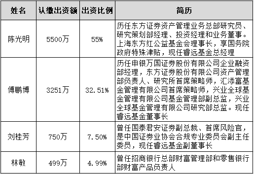 下图为睿远基金的股东构成情况。睿远的四位股东均背景不俗,有多年的金融业从业经验。除四位股东外,还有多名业界知名人士加盟睿远。如原东方证券资产资产管理有限公司研究总监吴非,交银施罗德的权益部副总经理、首席基金经理唐倩等。下面我们将主要介绍睿远的两大主帅:陈光明和傅鹏博。