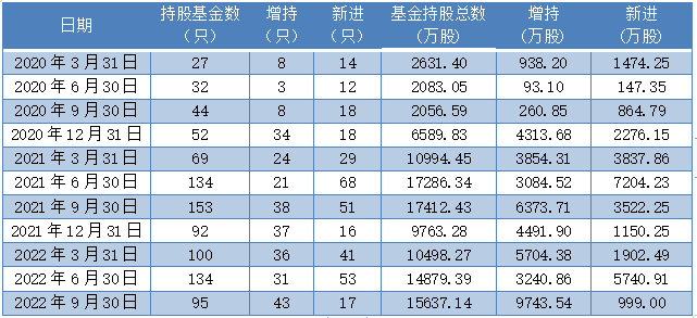 表1 2020年-2022年药明生物获基金增持和新进情况