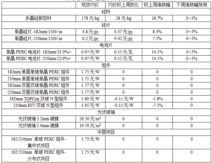 根据PVInfoLink数据计算整理,本周光伏行业产业链各环节价格及下周价格涨跌幅预测如下表所示。