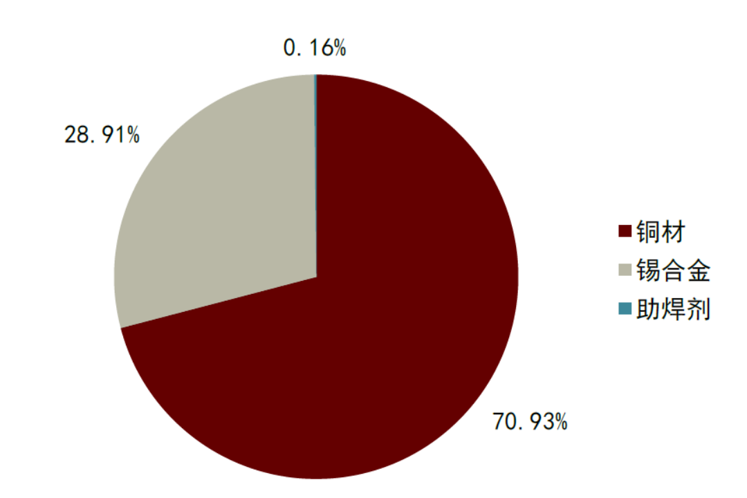 光伏焊带由基材、表面涂层和助焊剂构成,直接原材料铜和锡是成本主要构成部分。1)基材是不同尺寸的铜材,其规格尺寸精确、导电性能好,并具有一定的强度。2)表面涂层主要是由锡合金构成,可采用电镀法、真空沉积法、喷涂法或热浸涂法等特殊工艺按照一定成分比例和厚度均匀地覆裹在铜基材表面。由于铜基材不具有良好的焊接性能,锡合金层主要的作用是让光伏焊带满足可焊性,并将焊带牢固的焊接在电池片的主栅线上,进而起到良好的了电流导流作用。3)助焊剂是焊接过程中的重要材料,是化学和物理活性的混合物,加热时能除去焊料和可焊表面金属氧化物,以促进熔融焊料对金属基材的润湿。助焊剂可防止焊接时表面的再次氧化,降低焊料表面的张力,提高焊接性能。