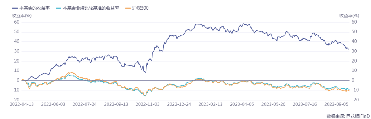 下图为该基金成立以来(2022年4月13日)收益率走势图,可以看出,该基金自成立以来就大幅跑赢业绩基准与沪深300指数,获得31.18%的收益率,今年以来收益率为-10.11%。