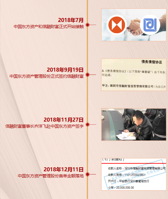 12月11日,四大资产管理公司(AMC)之一中国东方资产管理股份有限公司天津市分公司与信融财富签署了长沙可可槟榔屋有限公司、湖南卓越投资有限公司一份《债务清偿协议》,项目借款2000万本金已全额垫付并到账。