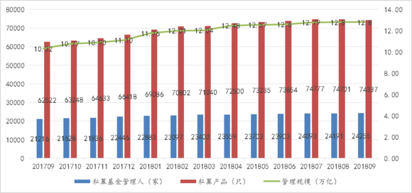 根据基金业协会公布的私募数据,截至2018年9月底,基金业协会已登记私募基金管理人24255家,较上月增加了64家;已备案私募基金74337只,较上月减少364只;管理基金规模达到12.80万亿元,增长了0.04%。