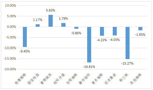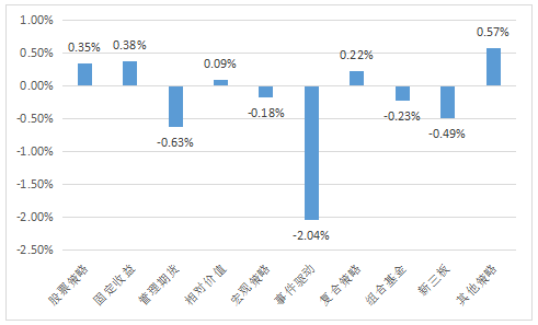 再看9月份的各个策略整体表现情况。9月份A股市场反弹的背景下,股票策略的收益率为0.35%,在八大策略里排名第二,与排名第一的固定收益策略接近。另外,相对价值策略和复合策略也都获得了正收益。事件驱动策略仍是跌幅最大的,下跌了2.04%,而前期表现很好的管理期货策略下跌了0.63%。