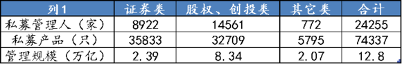 其中,私募证券投资基金管理人共有8922家,管理基金35833只,管理基金规模2.39万亿元,较上月减少了0.01万亿;私募股权、创业投资基金管理人14561家,管理基金32709只,管理基金规模8.34万亿元,较上月增加了0.03万亿;其他私募投资基金管理人772家,管理基金5795只,管理基金规模2.07万亿元,较上月减少了0.02万亿。
