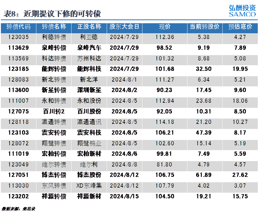 本周有3支转债宣布下修转股价格,其中强力转债和鹿山转债基本下修到底,第二天涨跌幅为-1.76%和6.25%,相对的,家悦转债下修不到底,第二天涨跌幅为-0.64%。另有16支转债已提议下修。具体情况如下表所示: