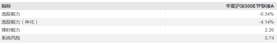 。其中,α为选股能力指标,β2表示择时能力。该基金的选股能力指标为-0.34%,小于零,说明基金经理的选股能力存在问题。而择时能力指标为2.26,这个指标相对较好,表明基金经理具有一定把握时机的能力,在专业素养和经验方面相对突出,对市场的整体把握比较到位。