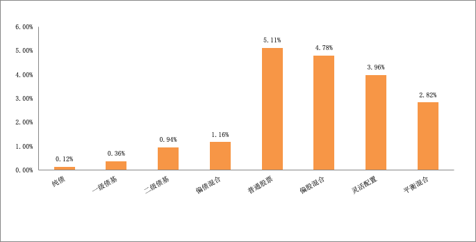 从图4可知,上周公募基金市场权益类基金表现较好,普通股票型基金、偏股混合型基金、灵活配置型基金、平衡混合型基金的平均收益率分别为5.11%、4.78%、3.96%、2.82%。
