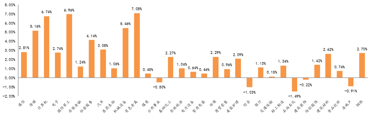 从行业板块来看(图2),上周31个申万一级行业板块整体表现较好,绝大多数行业板块都在上涨。具体来看,涨跌幅排名前五的行业依次为:有色、国防军工、计算机、机械设备、传媒,周涨跌幅分别为7.08%、6.96%、6.74%、5.64%、5.16%。周度下跌最多的五个行业依次为石油石化、综合、房地产、公共事业、建筑装饰,周涨跌幅分别为-1.49%、-1.03%、-0.91%、-0.50%、-0.22%。