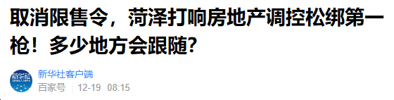 房地产市场的变化其实国家也都看在眼里,再加上中美贸易摩擦限制了中国出口,消费又上不去,麻烦事儿都扎堆了。此时,房地产这个解决中国经济增长问题的灵丹妙药自然再次被拿出来说事儿。于是,我们便看到中央政治局会议两次不提房地产,银行们上浮了22个月的房贷利率首次零增长有的甚至开始下降,房地产企业可以发债融资了,现在菏泽又率先打响了取消限售政策的第一枪,难道楼市调控政策放松真的来了吗?