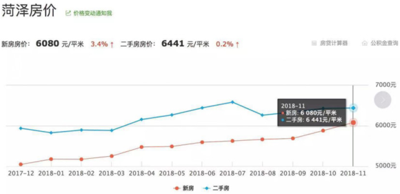 我们先看看山东菏泽市的情况。菏泽,山东西南部一个市区常住人口150万左右的三四线城市,一年前的2017年11月6日出台限售政策,新房和二手房的价格在过去也是相对平稳上行的。也即菏泽的情况只是代表少数三四线热点城市。