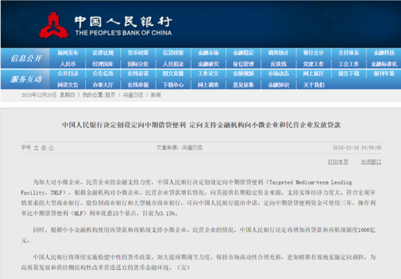 昨日晚20点,央行宣布创设TMLF工具,用于大型银行定向支持小微、民企。而抛出这份“特麻辣粉”的时间点耐人寻味,就是央行宣布创设TMLF(中期借贷便利)后的6个小时(北京时间12月20日凌晨2点),而此后一小时美联储将公布利率决议,市场普遍预期加息25个点。