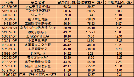 2019年,随着5G技术的进一步推进,通信、电子乃至整个TMT行业可能会进一步发展。目前重仓TMT行业超40%以上的基金共17只,如下图所示: