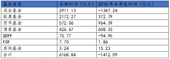 在公募基金收益情况方面,公募基金的整体盈利达到了6168.84亿元,较去年年底相比实现了扭亏为盈,其中非货币基金盈利环比增幅377.93%。具体来讲,权益类基金即股票型基金和混合型基金盈利比较高,仅第一季度,两种类型的基金利润合计超过5000亿,弥补了2018年整年亏损,相当于2017年整年的利润。