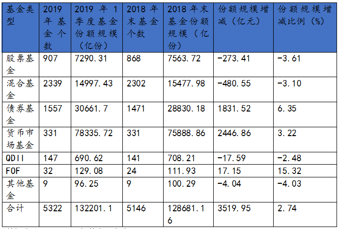 而固收类基金的债券基金,在2018年债市大牛之后,2019年一季度债券市场大幅震荡,虽有专业人士认为二季度债券收益将持续下降,仍未阻止投资者的热情;除此之外,由于货币政策的持续宽松,货币市场利率的走低,货币基金的收益率也持续下降,目前货币基金平均7日年化收益率已经降到了2.5%以下,在这种持续低收益的状况下,货币基金份额规模环比却增加了3.22%。