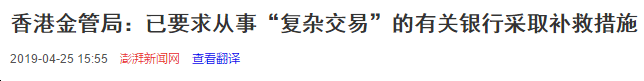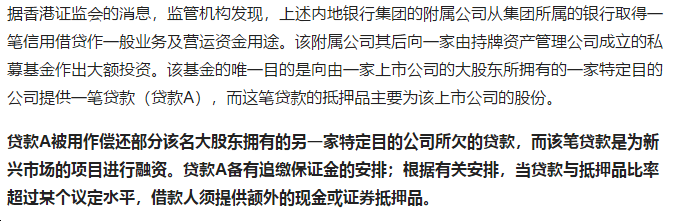 4月24日,也就是昨天,香港金融管理局与香港证监会于声称最近对一内地银行集团所属的一家在香港经营的银行及附属公司所拥有的持牌法团进行协调现场检查时发现,该集团通过私募基金及其他实体,进行了一连串“复杂交易”。而香港金管局已经要求相关银行采取补救措施。