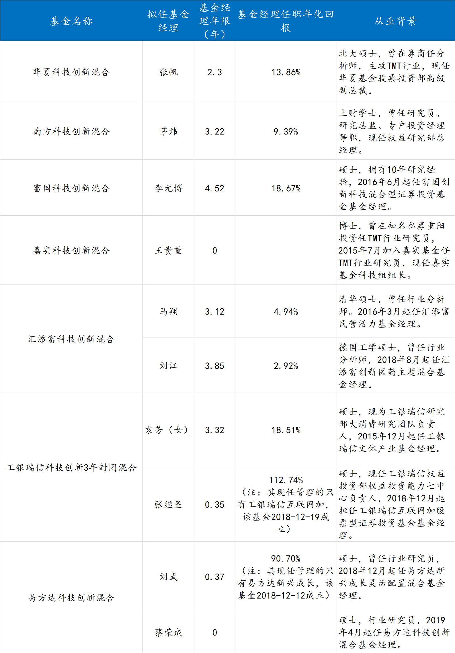 从资历来看,华夏、富国、嘉实三家基金公司的拟任基金经理明确有丰富的TMT或科技行业研究经验,较为符合科技创新方向,华夏、富国和工银瑞信两家基金公司的拟任基金经理有较为良好的历史管理业绩。但展恒基金君也要提醒大家,历史业绩也仅仅是一个参考,并不代表未来。
