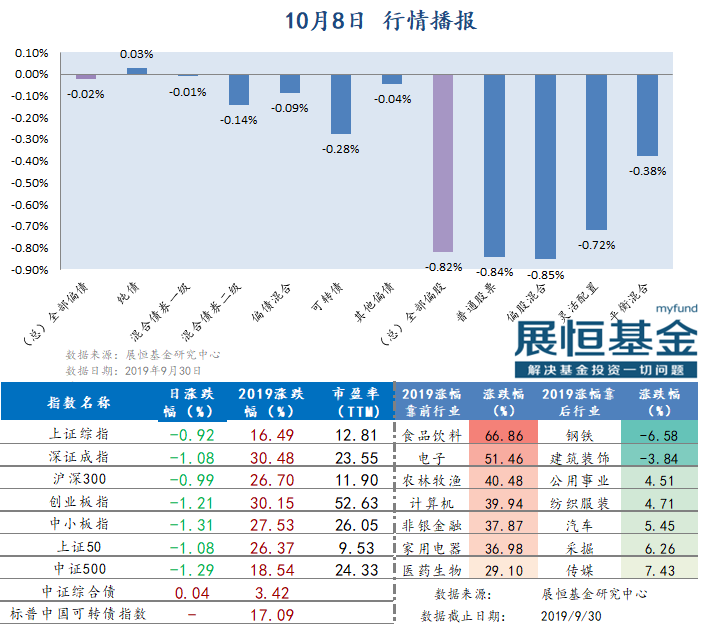 1、 【海外股市大幅波动 A股“价值洼地”特征凸显】“十一”长假期间,海外市场“黑天鹅”不断。在美国经济衰退“疑云”挥之不去、欧洲主要经济体经济数据爆冷不断、欧美贸易紧张局势加剧的背景下,海外市场前景难料。相对于欧美股票市场,A股市场指数点位与相应估值依旧处于偏低水平,在内地资本市场对外开放不断扩大、政策红利不断释放、外围市场不确定性加大的背景下,A股市场可能成为全球市场“价值洼地”。