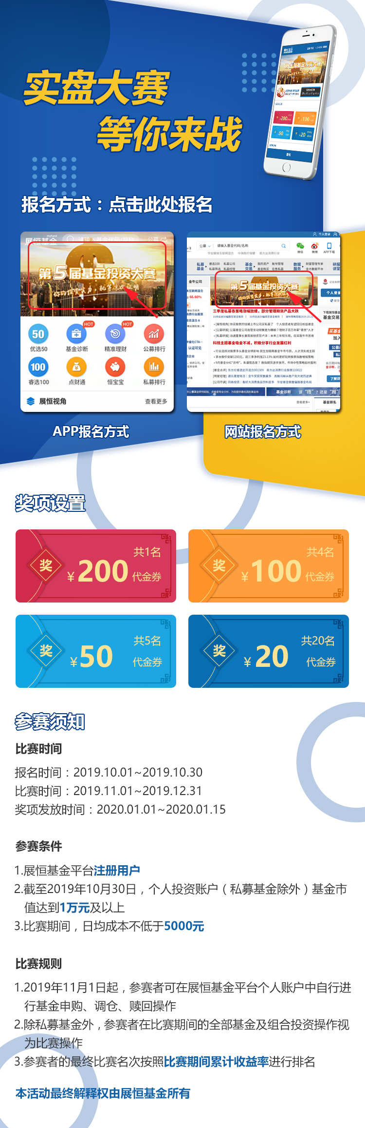 大家好,展恒第五届基金实盘投资大赛火热报名开始啦!无论你是新手还是老手,展恒基金为您提供一个真正属于你的投资平台,在这里,有专业的投资顾问等着您;在这里,还有基金代金券等您来抢!