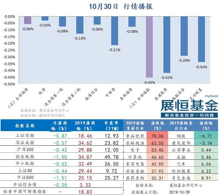 1、【公募基金三季末持有A股市值2.11万亿 占A股流通市值的4.76% 货币基金近年来首现负增长】今年以来,市场结构性行情,基金赚钱效应较为显著。公募基金持有A股市值稳步增长。最新数据显示,截至三季度末,基金持有沪深股票市值2.11万亿元,占A股流通市值的4.76%。货币市场基金资产净值规模为7.03万亿,相较2018年末的7.59万亿元,缩水约7个百分点,这也是近年来首次出现的负增长。