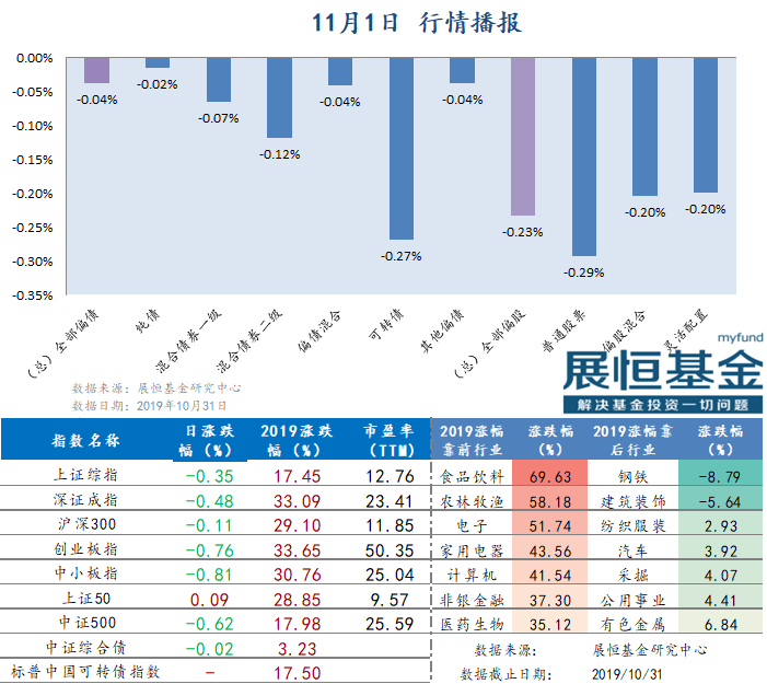 1、【美联储降息符合预期 公募认为中国股债吸引力提升】北京时间10月31日凌晨,美联储10月议息会议决定降息25bp,联邦基金利率下降至1.5%-1.75%区间。此次降息符合预期,且降低了年内再次降息概率。对于中国权益市场而言,美联储降息有助于市场情绪和风险偏好的提升。对于债市而言,随着中美利差走高,国内债券吸引力也将有所提升。