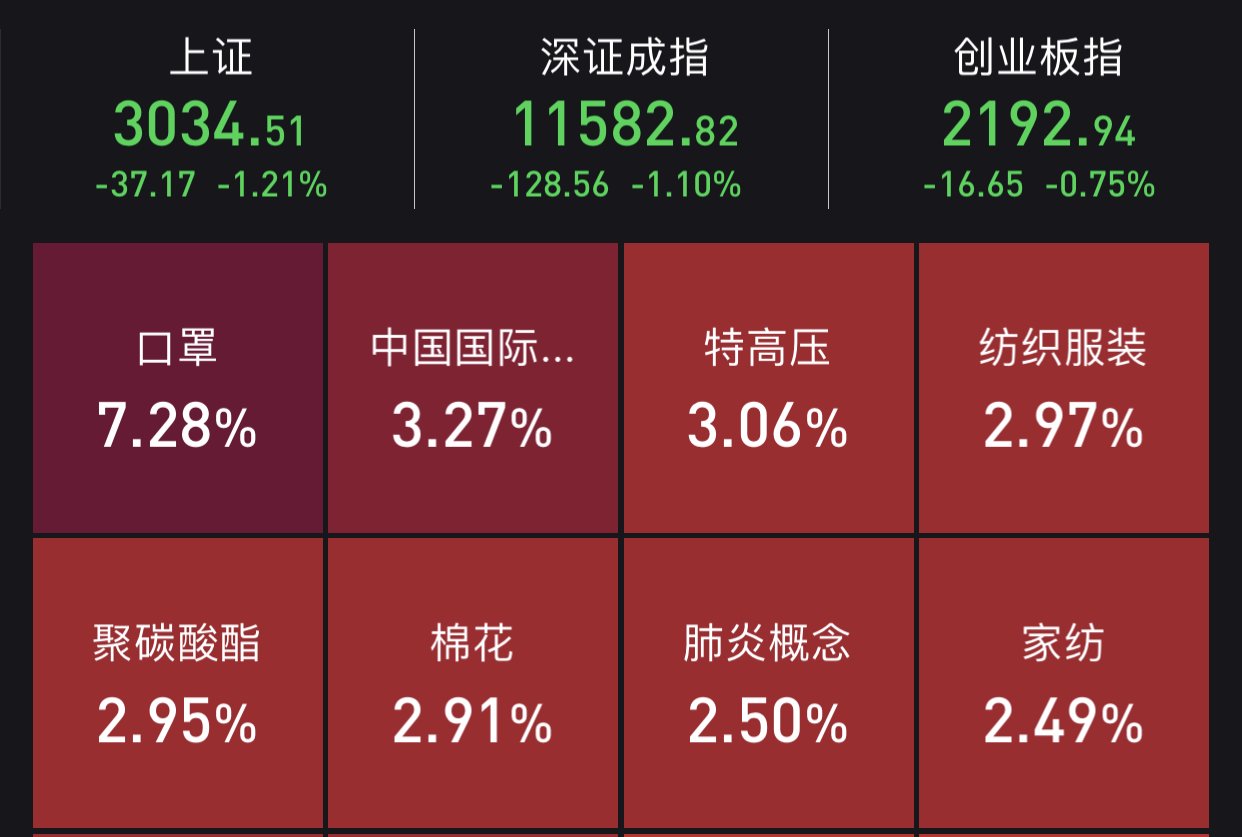 今日早间开盘,早盘三大指数集体低开,随后维持弱势震荡走势,创业板指表现较强,盘中一度冲高翻红。盘面上,口罩概念板块井喷,上涨7.28%,特高压、纺织服装、棉花等板块领涨;金融科技、鸡产业、建筑建材、房地产等板块跌幅居前。