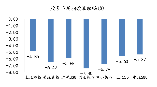 上周A股各指数均下跌。主要指数中,创业板指跌幅最大,整周下跌7.40%;深成指跌6.49%;上证综指跌4.85%,中小板指跌6.79%。。行业方面,上周各行业指数大部分下跌。仅通信、休闲服务微涨;纺织、有色金属、化工跌幅最大。上周融资余额小幅下降。截至上周四两市融资余额为11079.27亿元,比之前一周下降28.71亿元。其中沪市下降13.98亿元,深市下降14.93亿元。行业融资余额方面,上周各行业融资余额大部分上升。其中建筑材料、农林牧渔、通信等上升幅度较大;综合、房地产、休闲服务行业融资余额下降幅度较大。上周北上资金大幅净流出,整周共净流出417.95亿元。其中沪股通净流出263.52亿元,深股通净流出154.43亿元。