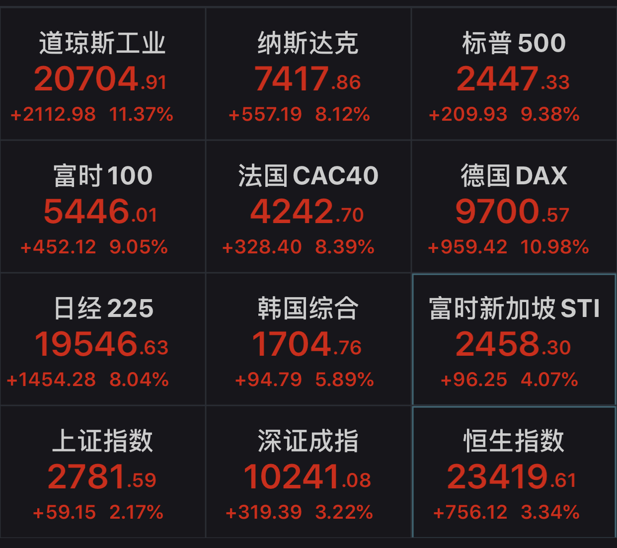3月24日周二,美股强势上涨,道指狂飙近2113点,创1933年以来最大单日涨幅,为历史第五大单日涨幅;纳指收涨8.12%,标普500指数涨9.38%。欧洲主要股指涨幅均超8%,金价涨近6%,美油涨近3%。