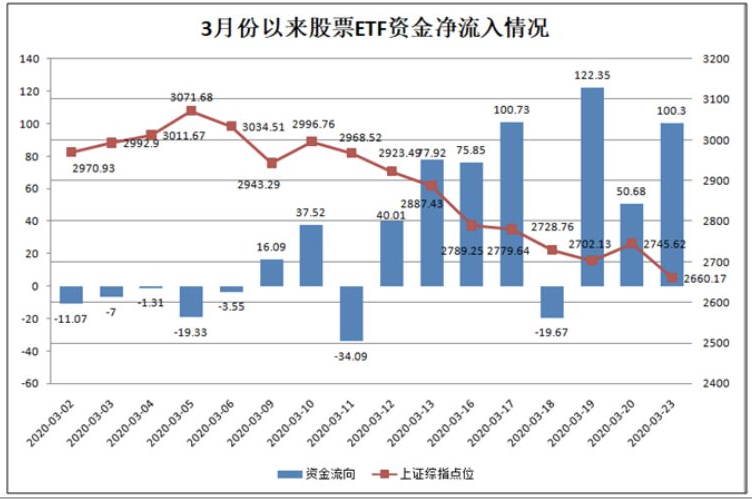 3月以来,共有三次单个交易日净流入资金破百亿的情况。在3月17日、19日、23日三个交易日的股指剧烈震荡中,股票ETF受到百亿体量大资金的大举买入的积极信号。而从近7个交易日的净流入情况看,ETF累计净申购资金高达500亿元之巨。