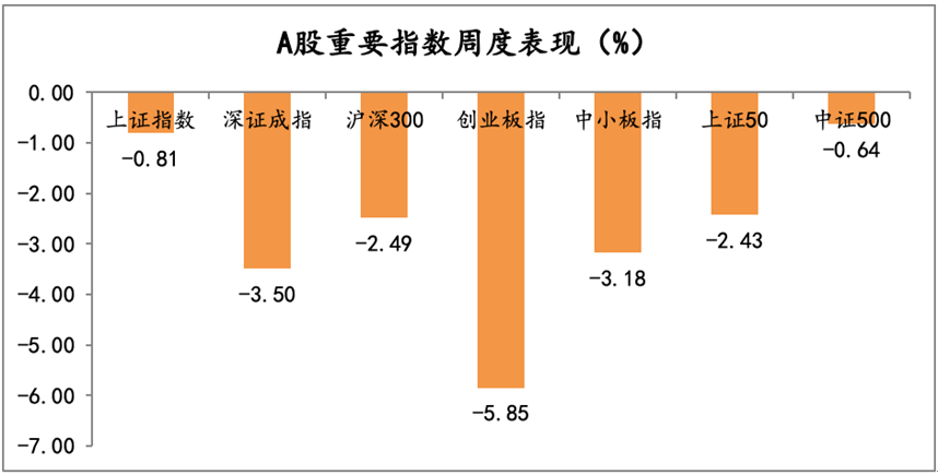 上周A股市场主要指数普跌。指数按照跌幅由高到低排序,依次为创业板指、深证成指、中小板指、沪深300、上证50、上证指数和中证500,周跌幅分别为5.85%、3.50%、3.18%、2.49%、2.43%、0.81%和0.64%。