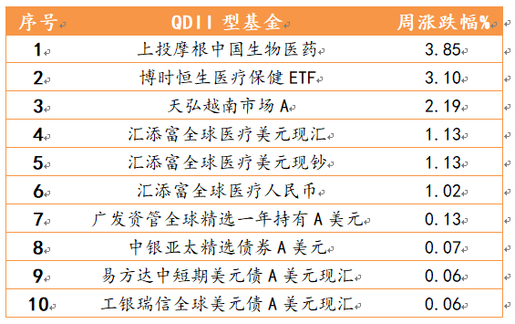 表1为上周各类型基金周度表现排名前十的基金列表。主动偏股型基金涨幅最好的是华夏医疗健康A,周涨幅9.60%;偏债型基金中收益回报位于榜首的为安信中短利率债A,周涨幅12.00%;QDII型基金中表现最好的是上投摩根中国生物医药,周涨幅3.85%。