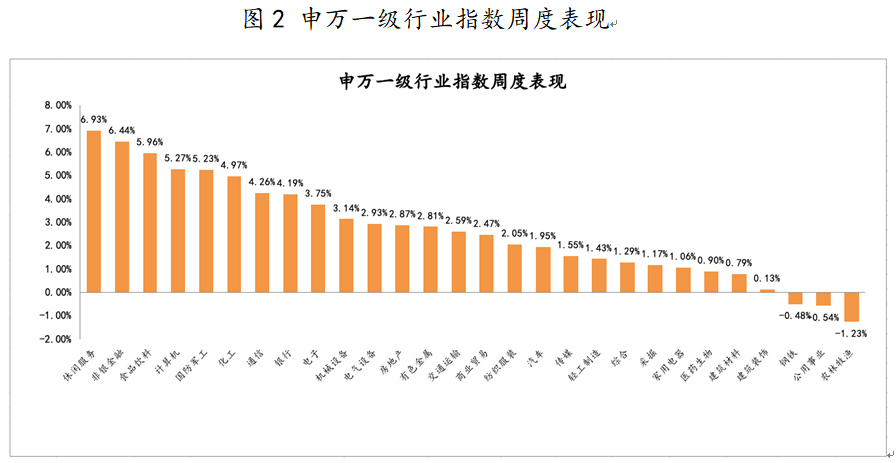 从行业板块来看(图2),上周申万一级行业指数中休闲服务板块大幅上涨,农林牧渔板块领跌。涨跌幅排名前五的行业为:休闲服务、非银金融、食品饮料、计算机和国防军工,周涨幅分别为6.93%、6.44%、5.96%、5.27%、5.23%;涨跌幅排名末五的行业依次为:农林牧渔、公用事业、钢铁、建筑装饰和建筑材料,周涨幅分别为-1.23%、-0.54%、-0.48%、0.13%、0.79%。
