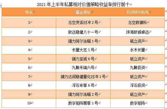 2021年上半年私募相对价值策略收益率排名前十的基金如下表所示,从图中可以看出念空数据科的念空灵活对冲2号在上半年中拔得头筹,致远稳健八十一号、镝力阿尔法喵1号、长量大志1号、镝力至诚6号、九鞅禾瑞六号、镝力达润稳健量化对冲1号、浮石专享6号、镝力阿尔法喵2号、数字矩阵尊享1号依次位列前2-10名。我们也可以关注到,砥立资产有四只产品入围前十,在各私募管理人中脱颖而出,可谓上半年相对价值策略的赢家。