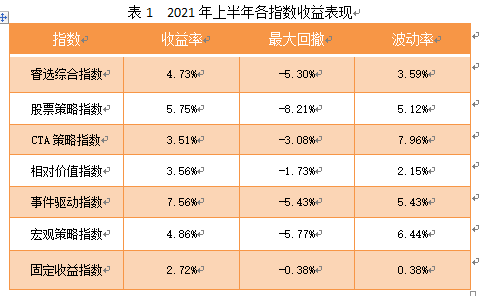 今天我们对私募各策略的收益情况做一下盘点。下表1为2021年上半年私募六大策略的平均收益率。从表中可以看出,六大策略的平均收益率都为正值,特别是事件驱动策略平均收益达到7.56%,在六大策略中排名第一,这主要与今年以来全球疫情反复、石油运输船搁浅等事件相关,周期股板块增长势头较强。上半年A股市场持续震荡,虽春节后出现急速调整,但二季度以来走势良好,因此股票策略的平均收益率排名第二,涨幅为5.75%。另外,由于我国疫情控制良好,经济恢复较全球其他国家领先,房地产和工业发展较快,因此宏观策略整体表现良好,平均收益率排名第三,为4.86%。而一季度走势最强劲的管理期货策略伴随着全球范围内经济恢复、美联储货币政策收紧预期和通货膨胀预期影响,5月份以来大幅下调,截止当前平均收益率仅为3.51%。相对价值策略随着各指数基差的下降,表现略有好转,截止6月底,收益率也仅为3.56%。