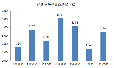 据图一可知,截至上周五收盘,上证综指收于2,968点,较前一周上涨了1.64%;深证成指收于11,668点,较前一周上涨了3.70%;沪深300指数收于4,099点,较前一周上涨了2.39%;创业板指数收于2,319,较前一周上涨了5.11%;中债总财富指数收于196.73点,较前一周下跌了0.45%。行业板块方面,涨跌幅前三的分别是:农林牧渔(6.29%)、医药(5.78%)、通信(5.27%);涨跌幅后三的分别是:银行(-0.54%)、国防军工(0.53%)、交通运输(0.55%)。